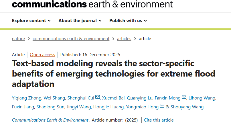 beat365正版唯一官网必一副教授孟凡鑫合作研究发表在Nature旗下期刊《Communications Earth & Environment》揭示新兴技术应对极端洪水的作用机制