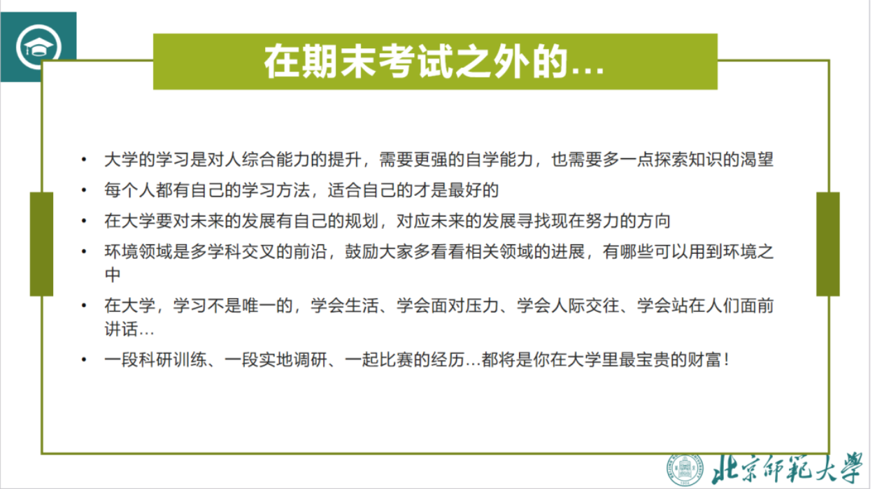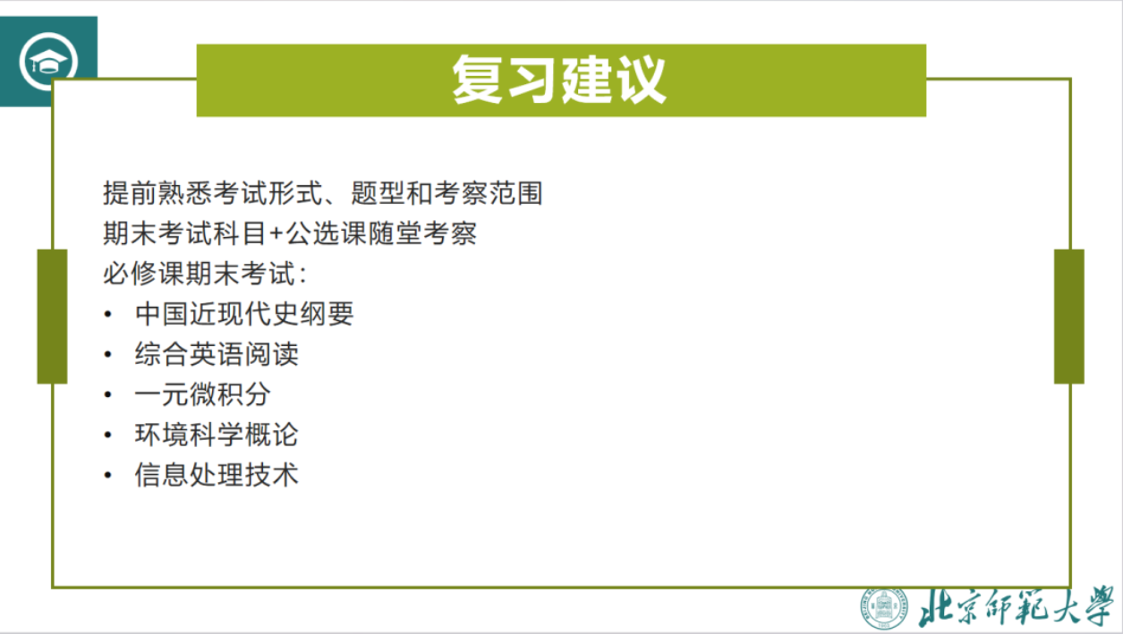 他还具体讲述了中国近现代史纲要、一元微积分、环境科学概论等课程的考试重点,并提醒大家考前不要通宵复习,早睡早起保持良好作息。