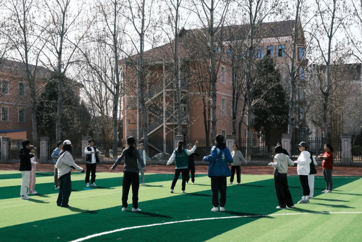 活动之前的热身环节是必不可少的。专业教练带领同学们进行了行进间热身和动态拉伸,使同学们更快进入运动状态,减少受伤的可能性。随后,教练向同学们详细介绍了飞盘这项运动,耐心地传授大家握盘以及传接盘的技巧,重点讲解了掷飞盘的反手握法和正手握法,同学们都在一旁认真地聆听学习。