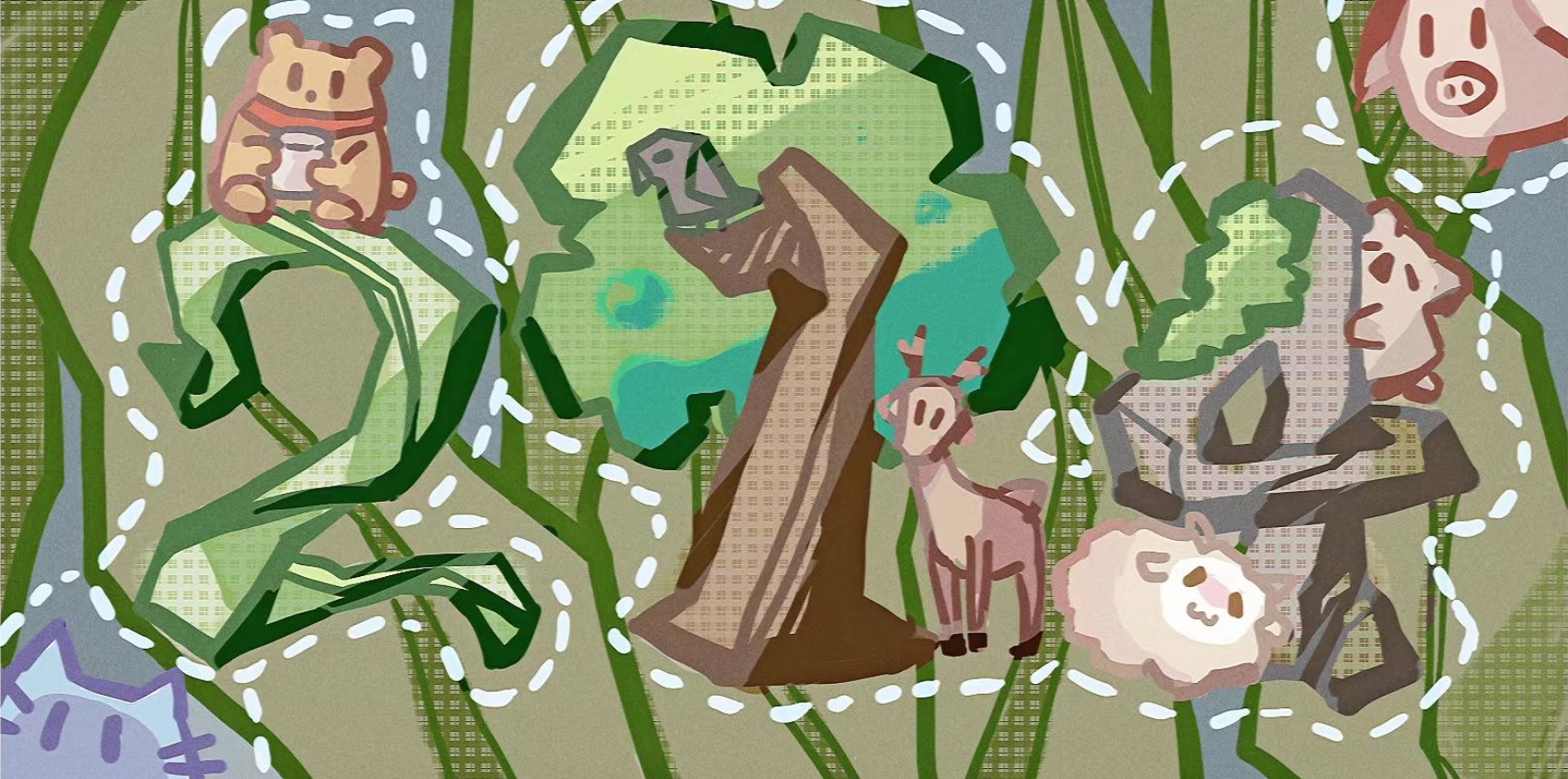 创作内涵:我们的主题是万物之森!214三个数字造型分别来自藤蔓、大树和岩石的创意,图中的小动物分别是每个同学为自己选择的代表动物(鸦鸦子就是代表bnu嘿嘿:)背景的草叶随意摇曳,蓝色铺底,既可以是蓝天也可以是流水,寓意着万物生灵在自然天地间和谐共生,也是环境人的初心与理想!(纯原创绘制,手艺人不容易,给我们投个票吧)