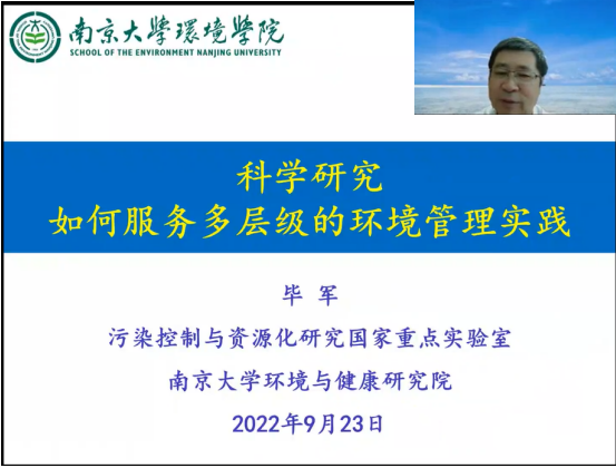 9月23日下午,为庆祝beat365正版唯一官网必一建校120周年、beat365正版唯一官网必一建院40周年,京师环境讲坛(校庆&院庆篇)以线上学术报告形式顺利开讲。首讲嘉宾为beat365官网校友,教育部长江学者特聘教授、国家自然科学基金委创新群体负责人、污染控制与资源化研究国家重点实验室(南京大学)主任、南京大学环境与健康研究院执行院长毕军学长,讲座题目是《科学研究如何服务多层级的环境管理实践》。院长沈珍瑶教授主持本次讲坛,beat365正版唯一官网必一师生及部分校友300余人参加。
